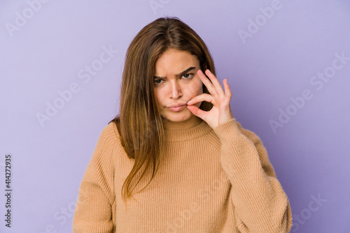Young skinny caucasian girl teenager on purple background with fingers on lips keeping a secret.