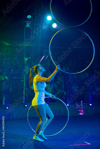 Young slim attractive circus gymnast woman performing live show with hula hoops on red arena with blue backlight, audience is excited