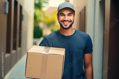 Young smiling delivery mailman delivering parcel cardboard box in front of a house door.