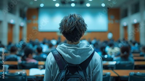 Young student at the front of class with a rear view