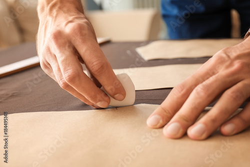 Young tailor working with sewing pattern, closeup