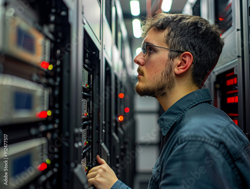 Young Technician Working Intently on Server Equipment in Data Center During Evening Shift