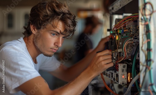 Young technician working on a computer motherboard with precision in a tech lab