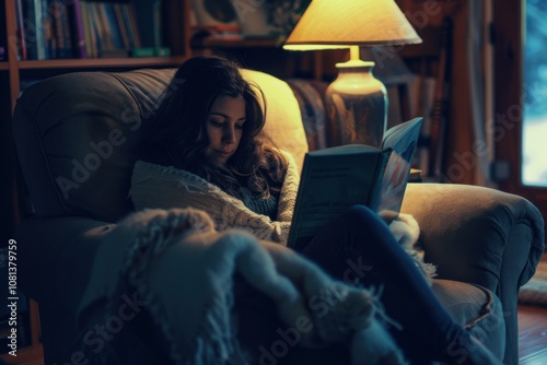 Young Woman Cozy at Home Reading a Book in a Comfortable Armchair