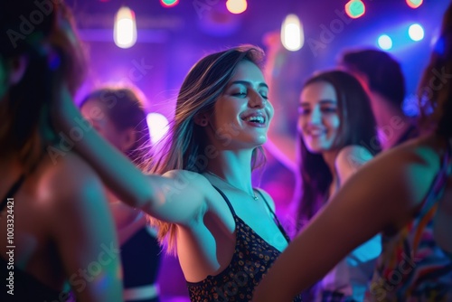 Young woman dancing in nightclub. Female celebrates nightlife, freedom, joy. Beautiful caucasian model wearing stylish clothes, dancing to music in dark club. Carefree atmosphere, colorful lights,