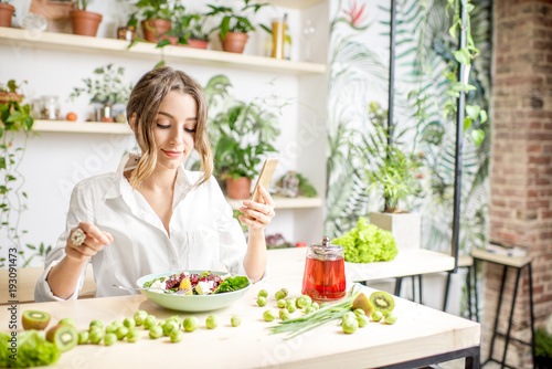 Young woman eating healthy food sitting in the beautiful interior with green flowers on the background