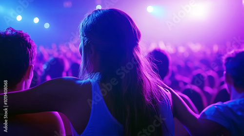 Young Woman Enjoying Concert in Vibrant Neon Lighting.