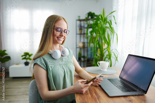 Young woman enjoys music while working at her home office