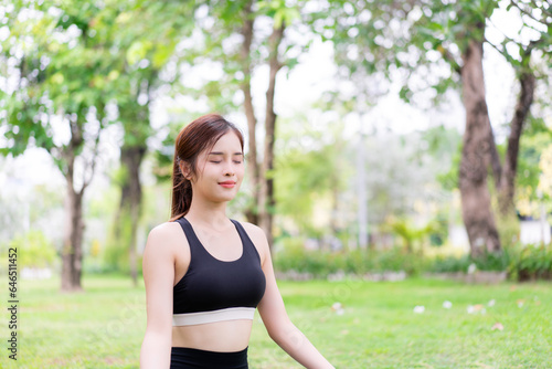 Young woman Finding Inner Peace in Yoga Pose at the Park. Yoga and Meditation Concept. Female exercising and stretching in Nature.