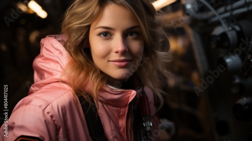 Young Woman in Pink Jacket Inside a Spacecraft: A Blend of Beauty and Space Exploration