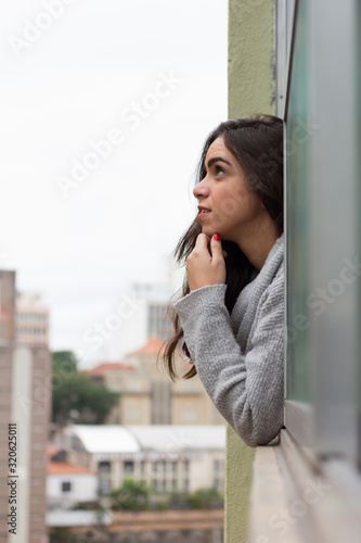 Young woman looking out the window at Sao Paulo city. Thoughts about the future, emotions, planning and tranquility. Buildings in urban scene.