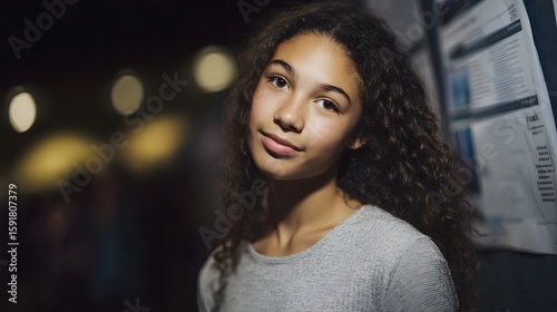 Young woman presenting a science project in focused lighting