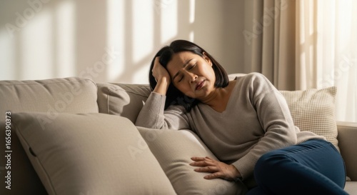 Young Woman Sitting on Couch Feeling Unwell in Bright Living Room