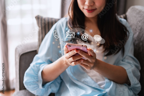 Young woman using phone with email and chat message icon, Customer support hotline Contact us concept