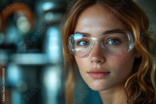 Young woman wearing protective glasses poses confidently in a modern workspace filled with equipment