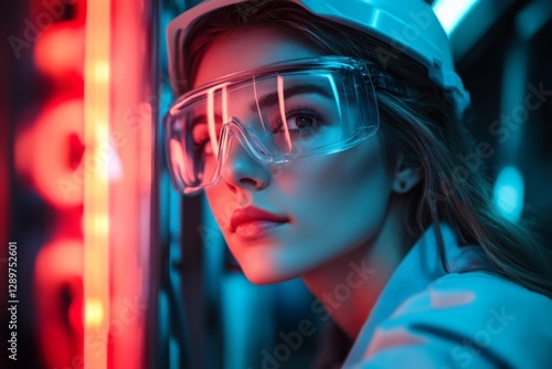 Young woman wearing safety glasses and a hard hat poses in a brightly lit industrial setting at night