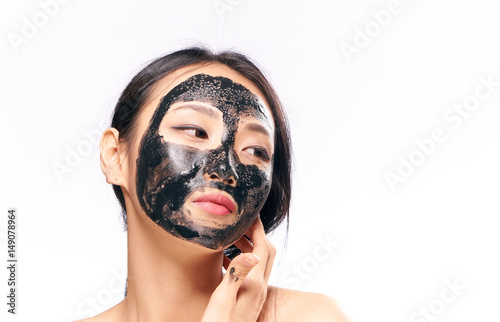 young woman with black mask on face, removal, scrub