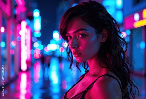 Young woman with wavy hair stands in a vibrant neon-lit urban street at night