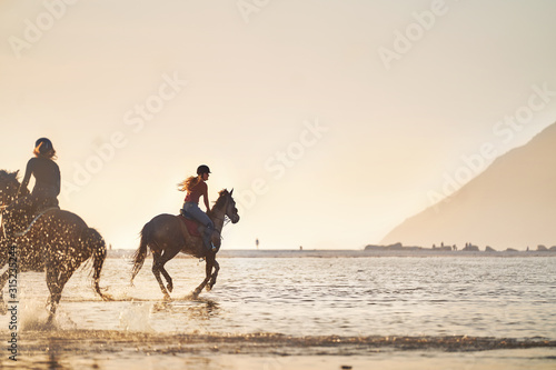Young women horseback riding in ocean surf at sunset