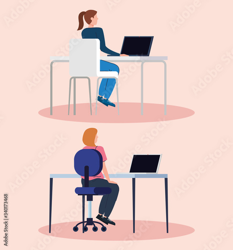young women with computer in desk vector illustration design