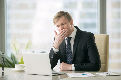 Young yawning businessman working with laptop at desk in the modern office, unmotivated employee, not completing job duties, do not have the drive to succeed, dissatisfaction in office environment