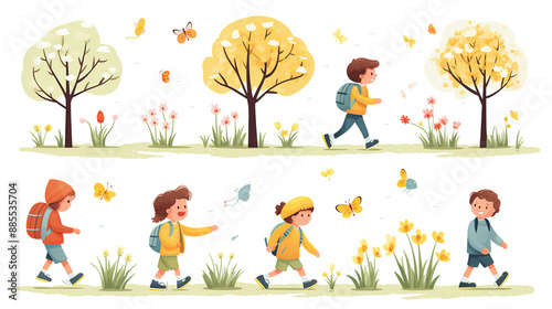 Youngsters outside during the springtime, isolated on a white background