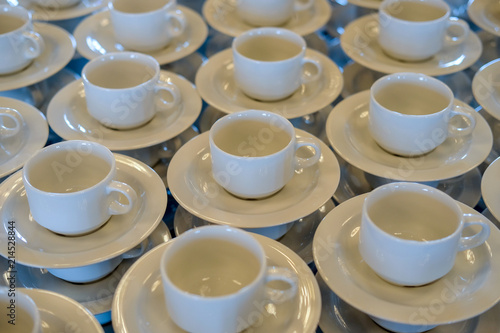 Zahlreiche weiße Kaffeetassen während einer Veranstaltung aufgebaut zur Selbstbedienung