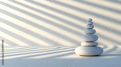 Zen stone stacking practice tranquil indoor setting minimalist design calm environment natural light mindfulness concept