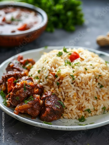 Zimbabwean peanut butter rice, a traditional dish cooked with peanut butter and served with a hearty meat stew, presented on a plate.