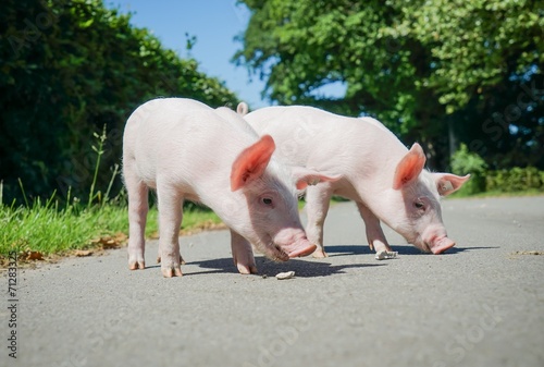 Zwei Ferkel auf einer Straße, Froschperspektive