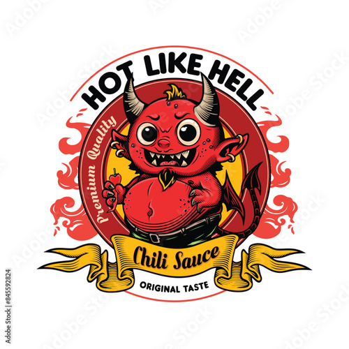 "Hot like Hell. Chili Sause. Original taste. Premium quality" - Sauce design label. Vector illustration in engraving technique of cute little horned devil with wings.