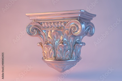 "A surreal floating architectural fragment made of liquid chrome and translucent glass, softly glowing with pastel light. The surfaces appear to ripple like fluid metal. Minimal soft background