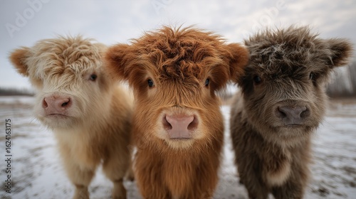"Adorable Highland Calf Trio in Winter Landscape – Cute Baby Cows in Snow"
