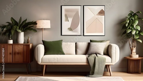"Cozy living room with a white sofa, wooden sideboard, and green stand. Lush plants, a stylish lamp, and a mock-up poster frame add a personalized, inviting touch."