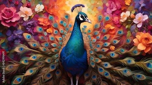 "In a garden filled with a rainbow of flowers, a regal peacock twirls and spins, its feathers fanning out in a stunning array of colors and patterns."
