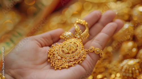 "Elegance in Detail: Close-Up of a Female Hand Adorned with Gold Jewelry" "Golden Grace: Close-Up of a Hand Holding Exquisite Gold Ornaments"