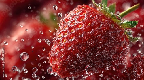 "Photorealistic close-up of a fresh strawberry, detailed seeds and water droplets, soft natural lighting highlighting textures, immersive macro view for culinary or design use.