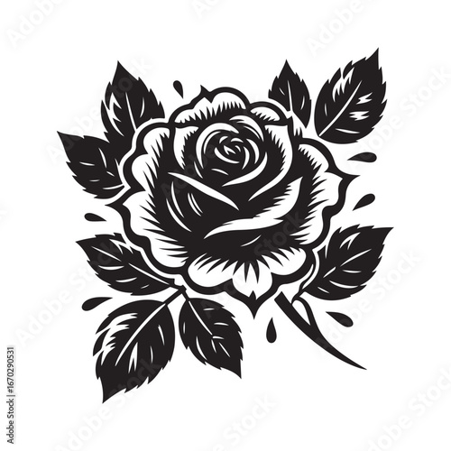 Intricate rose tattoo silhouette with elegant swirling petals and delicate thorns, isolated on a clean white background