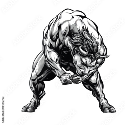 "Powerful minotaur silhouette; muscular man figure in bold black line; minimalist design on white background; perfect for commercial use and professional projects"